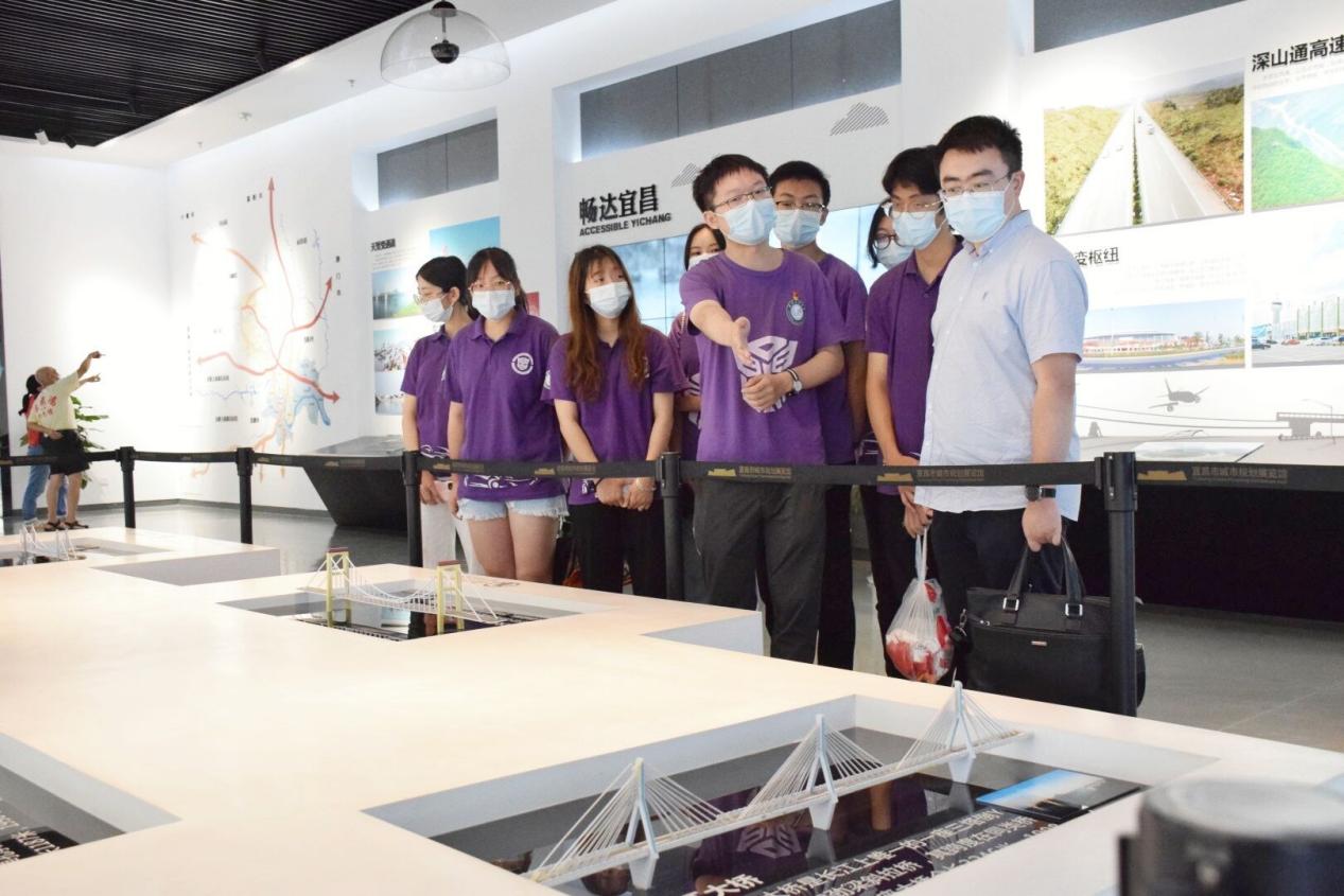 在展馆中,团队成员按专业分为交通工程和物流工程两队,分别对宜昌市交通规划和三峡枢纽港区两个方面进行了特色讲解、学习分享。